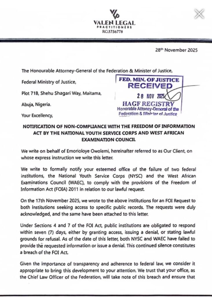 Meanwhile, the senior counsel representing Prince Owolemi has been instructed to proceed with court action to compel compliance by the concerned institutions. It remains uncertain whether the Attorney General’s office will be able to facilitate the release and publication of the requested records from NYSC and WAEC without judicial intervention.